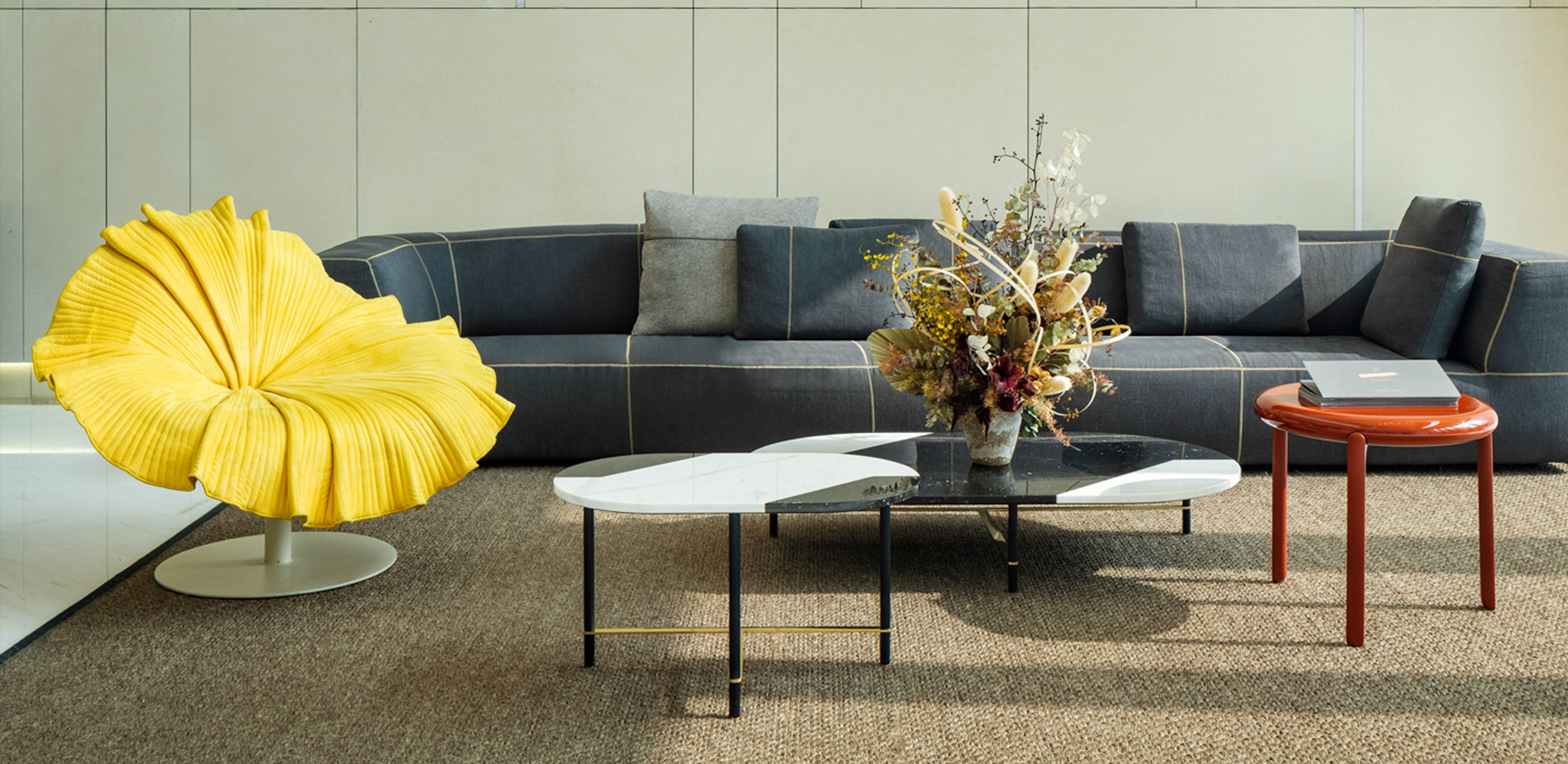 沙发凝结了匠人的精湛工艺,模仿花朵在自然中的状态,轻松为室内带来活泼的自然风格。尔邸备有红黄绿等多个颜色的“花朵”,会根据季节或活动随时更换,令宾客常有新鲜感。